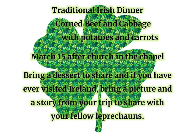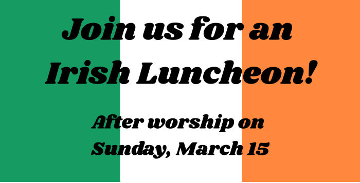 March 15 after the worship service is our next Around-the-World luncheon! We will be serving corned beef and cabbage, as well as other Irish-themed dishes. We hope you will come eat, drink and fellowship with us!